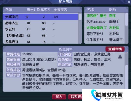 【苏堤春晓】各大帮派的职能划分明确,各位入驻的玩家可通过帮派公告判断帮派类型,以此选择最适合自己的帮派加入。