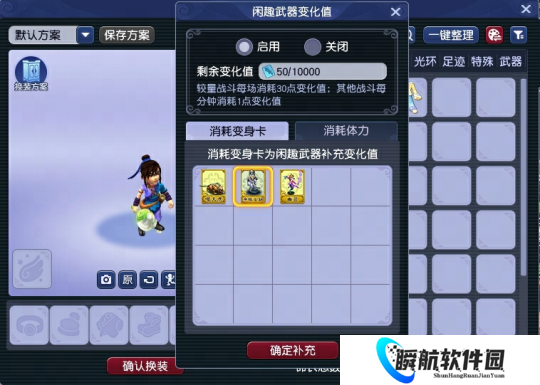 2)消耗变身卡(不含泡泡变身卡、神兽变身卡)使用次数或一定体力,可为闲趣武器补充变化值: