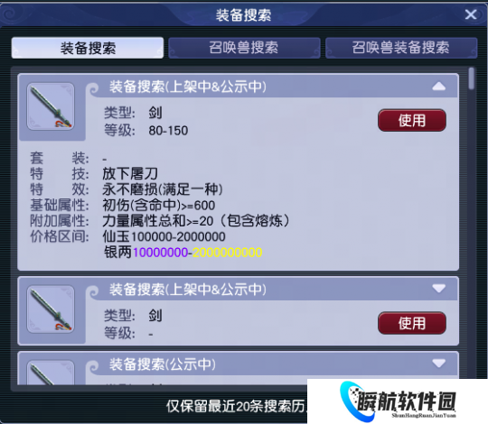 b.装备搜索、召唤兽搜索、召唤兽装备搜索新增“搜索历史”功能,支持保存最新的20条搜索记录:
