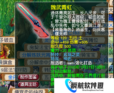 玩家鉴定出一把120级法系武器,命中459、伤害505,且附带神佑与玄鸟之灵特效。