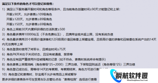 需满足十点要求才能寄售角色,总结如下。开服时间越长,允许寄售的角色等级越低(最低要求是69)。寄售角色不仅要在30天内至少获得500点总活跃度,还需绑定将军令不少于75天,此外还不得有相关违规行为。角色上架时还需消耗三界功绩,计算公式为:等级 × 25 + 2000(消耗范围介于3725至5875之间)。同时,角色身上携带的仙玉、装备与召唤兽也受到相应限制。