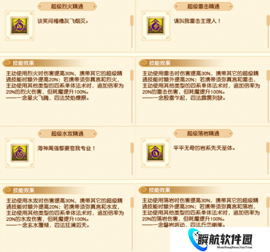 温馨提示:「超级四系法术精通」相比「低级四系法术精通」和「高级四系法术精通」,还多了一项“携带其他超级精通技能时额外提高单法伤害”的增伤效果。