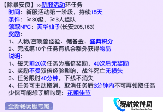等级达到30级后,少侠们可组队前往芙华仙子处领取除暴安良任务,这是新服特色的新手任务,每天前20次高倍奖励,一定要刷。
