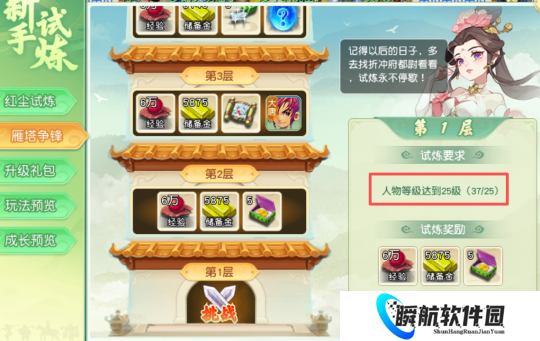 完成第一天的“仙石天机”任务后,咱们可以前往折冲府都尉处开启雁塔试炼。大约挑战完7层就可以达到30级了。