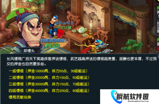 等级达到30级后,少侠们前往长风镖局,通过郑镖头领取运镖任务。运镖任务是前期获得储备金的主要渠道之一,对我们的成长有着至关重要的作用。