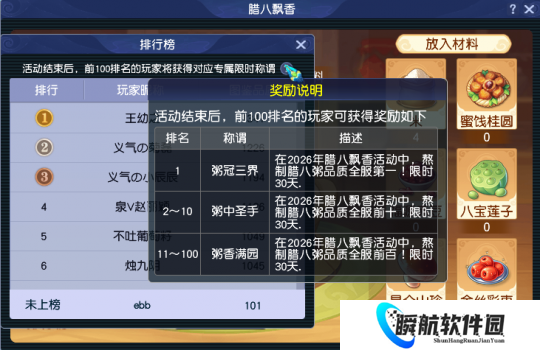 畅玩服腊八节活动于1月22日12点全服放出,腊八节排行榜前100的少侠还有称谓奖励,其中排名第一拥有全区唯一的“粥冠三界”称谓。