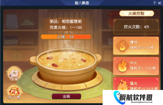 熬制腊八粥的时候可以使用1到5次控火来提高火候,每类粥品有独特的完美火候值,最终出锅时的火候越接近完美火候则出现高品质粥品的概率越高。