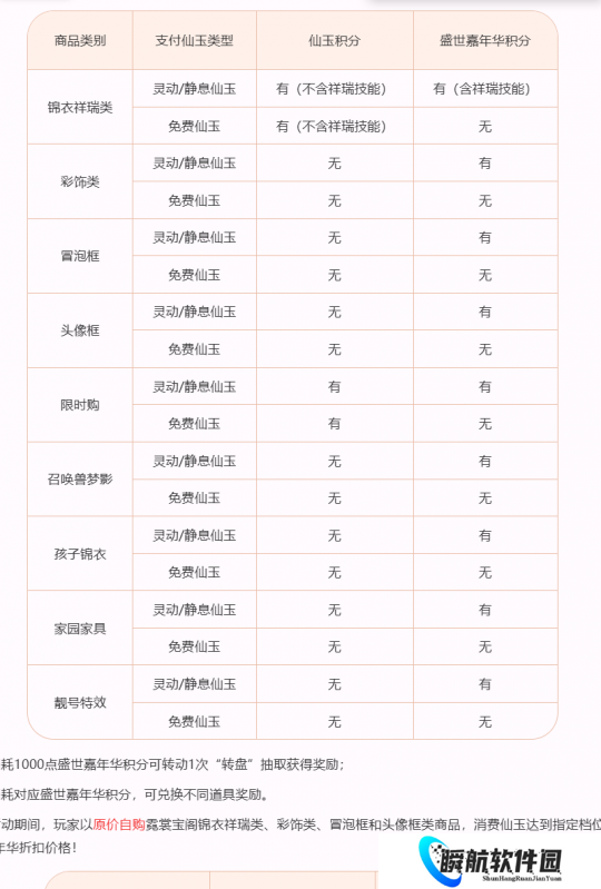 活动期间,购买霓裳宝阁以下商品、或限时购商品,每消费1点仙玉可获得1点盛世嘉年华积分: