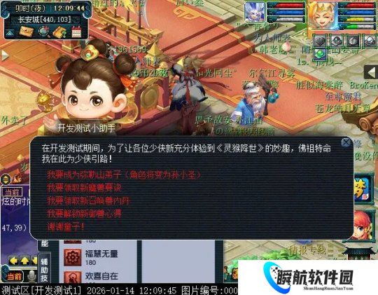 1月14日12:00,玩家在开发服PK台兰虎处可找到测试小助手,在其帮助下可化身为新角色孙小圣,并自动拜入新仙族天命门派“弥勒山”,抢先体验新玩法。