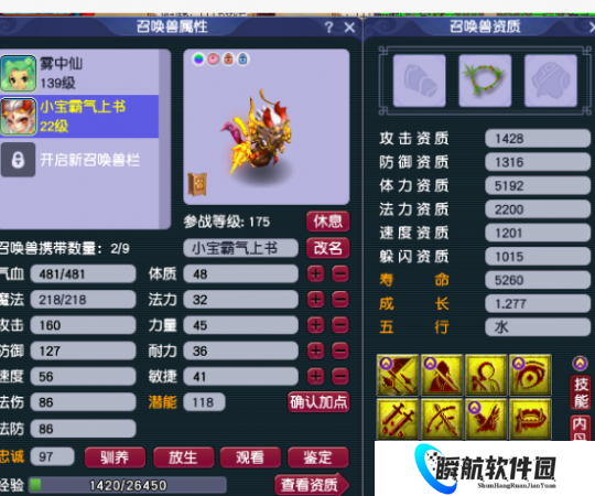 这只胚子是新出的,是给69级精锐玩家使用的。它虽然没有带什么特殊技能,像台子和须弥真言之类的。但是9个技能打全红已经是没有一点疑问的。而且这个胚子的底子是很好啊,我们看到攻击资质是1534点。