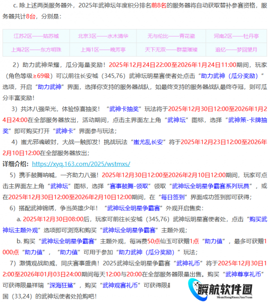 下面是本周具体的维护情况:2025年武神坛全明星争霸赛精彩来袭,今年的全明星争霸赛有2025年度武神坛冠亚军服务器、积分排名前25名的服务器,另外积分排名前8名的服务器自动获取替补参赛资格。12月30日至26年1月3日,全部服务器限量出售深海狂鲨、朝天吼,重大赛事必定返场的两类祥瑞。