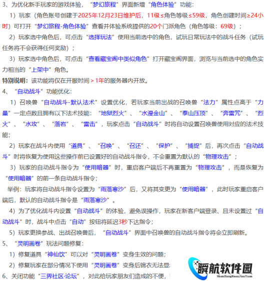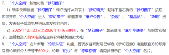 本周二系统维护,大多都是上周测试服内容全服开放,另外本周还新增加了梦幻圈子功能,在12月23日至26年1月6日期间,在梦幻圈子频道使用嘉年华趣事前缀发布帖子,可以获得周边大礼。一起来看看本周的具体维护情况吧。