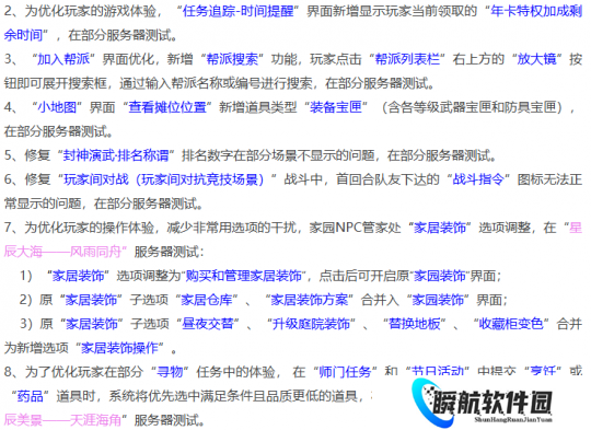 任务追踪时间提醒界面显示年卡特权加成剩余时间。加入帮派界面优化,新增加搜索功能。小地图查看摊位位置增加装备宝匣搜索。修复:封神演武-排名称谓;玩家间对战功能。调整家园管家出家具装饰选项;部分寻物任务体验。