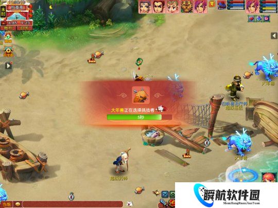 5、当有玩家选择挑战大年兽时,进行持续5秒的倒计时。倒计时结束后,从这段时间内所有向大年兽发起挑战的队伍中随机选择一队,进入战斗。