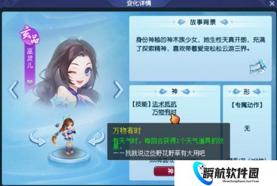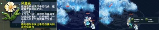 风天时,变身“巫灵儿”玩家的宝宝将获得风息花效果,提升宝宝约25%的伤害(宝宝触发瞬法或瞬击特性时无法受到风息花加成)。