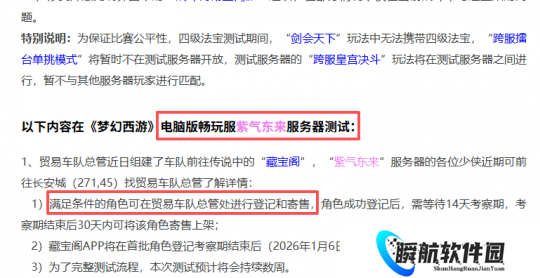 本次更新,畅玩服在【紫气东来】服务器开始测试开放“畅玩服藏宝阁”,目前只允许交易角色,而且对携带宝宝、道具等不做限制,交易手续费为8%,手续费上限为20000元。