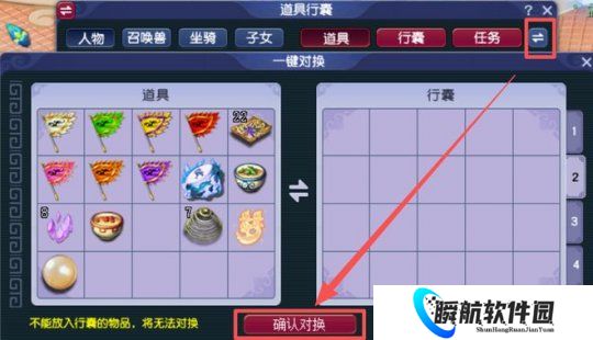 使用物品栏新界面时,咱们可通过右上角的蓝色箭头按钮实现“道具—行囊”一键切换。这项功能能让咱们避免将道具栏的物品一件一件“手动丢行囊”的困扰。咱们可以利用这项功能摆摊卖东西、打区内比武大会或帮战等等,借此节约大量整理背包的时间。