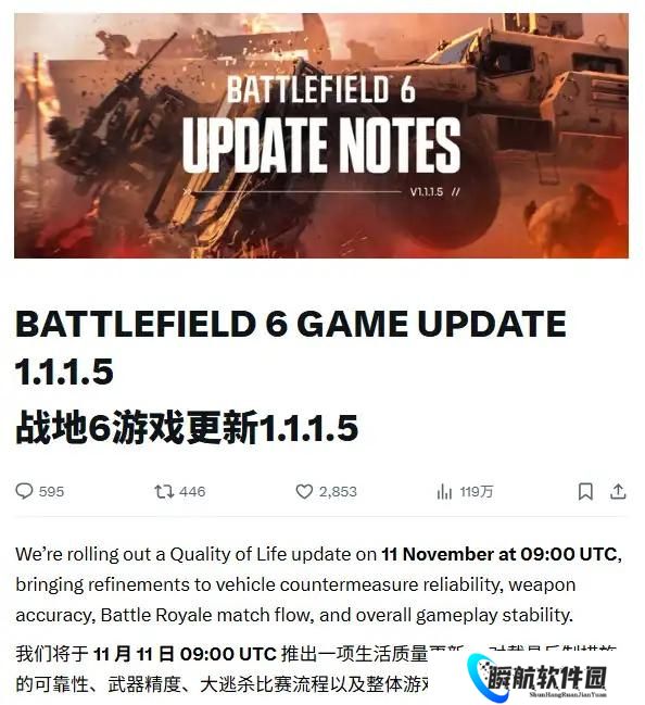 《战地6》目前已经在 PlayStation 5、Xbox Series X|S 和 PC 平台正式发售。1.1.1.5版本更新将于北京时间11月11日17:00面向全球玩家推送。