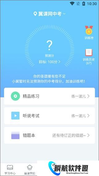 1、在本站下载好翼课网英语口语训练app,进入“学习中心”板块,可以看到错题本、作业以及考试等内容。