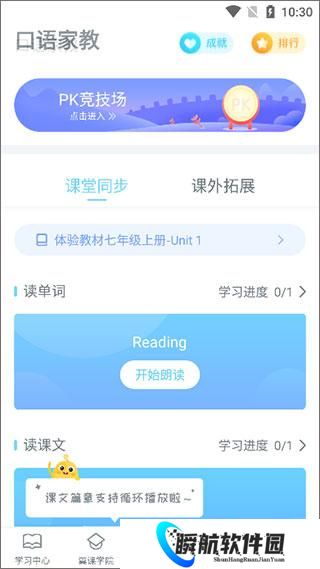 3、在“口语家教”板块,有PK竞技场,你可以和其他用户进行在线PK。同时还有读单词、读课文等功能,快速提高你的口语能力。