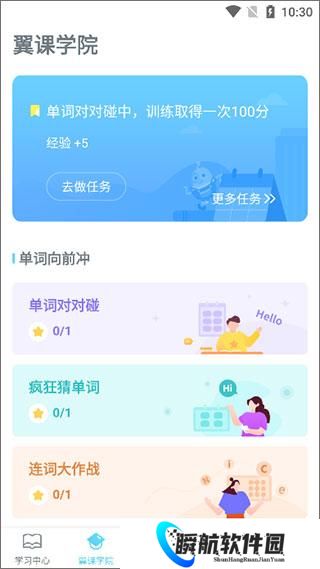2、在“翼课学院”界面,您可以做任务,训练提高英语能力的呦,有单词对对碰、疯狂猜单词、连词大作战等等。