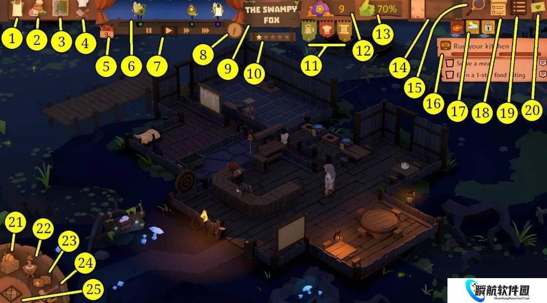 1、雇用员工:此按钮用于雇用新员工。您每周只有这么多申请,但您可以花费金币来解锁更多申请人;每次使用此选项,获得新申请人的黄金成本都会增加。每周都会产生新的申请人。2、存储概述:此按钮显示您在酒馆中拥有的所有产品和消耗品。3、世界地图:这会显示地图,您可以在其中从商店购买酒馆的食物、饮料和其他物品。4、酒馆菜单:这向您显示了您可以出售给顾客的食物和饮料。5、日历: 这会显示一周中的某一天以及您经营酒馆的天数。您可以单击日历打开事件日志并查看发生了哪些重大事件,例如交付或特殊事件。6、事件跟踪器:此轨道向您展示重要事件何时发生。其中包括您的酒馆开业或关闭、待付款、送货、商家到来(如适用)、新员工申请以及故事书等特殊活动。7、时间控制:这些按钮可让您暂停游戏或加快游戏时间。8、时钟: 正如您所料,这显示了当前的游戏时间。9、酒馆名称:屏幕顶部中央的标语牌显示您的酒馆名称。您可以右键单击该标志来更改酒馆的名称或暂时关闭您的酒馆,只要您愿意。请记住,当酒馆关门时,您仍然需要支付员工工资!10、酒馆评分:酒馆的总体评分由酒馆名称下方的星星表示。获得更高的评级可以在该场景中解锁新物品并吸引更高级别的顾客。大多数场景对您可以到达的星星都有最大上限。11、酒馆进度横幅: 酒馆评级右侧的旗帜可以突出显示,以显示您的每项服务的级别:食物、饮料、住宿、服务等。您可以通过将鼠标悬停在旗帜上来了解如何提高每个部门的星级。12、金: 这显示了您目前有多少钱。如果这变成负数,那么在您破产并不得不加载较旧的储蓄之前,您只有不到一天的时间赚到足够的钱来再次使其变正。13、顾客满意度:这表明参观您酒馆的顾客有多满意。单击它即可按类别查看他们的满意度明细;这是识别酒馆特定元素的任何问题的好方法。14、顾客吸引板:顾客吸引力板一旦解锁,您就可以大致了解在不久的将来将有多少顾客到达。您还可以使用它来邀请顾客团体以获得额外的钱。15、大气叠加:氛围叠加工具可让您查看酒馆在消防安全、清洁度、装饰等方面的状态。16、通知和目标:您当前的目标始终列在屏幕的右上角。如果发生重大事件(例如火灾或故事书),这里会弹出一个窗口,让您知道它。17、警告:有关您的酒馆的任何重要状态消息(例如库存不足或受到侵扰的影响)都会显示在这里。您还可以查看此处列出的方案特征,这些特征解释了您当前正在工作的任何特殊条件。18、侧面通知:按下此按钮将折叠“通知”窗口。19、暂停菜单: 此按钮将弹出暂停菜单,您可以在其中保存游戏、离开酒馆等。20、发送反馈:按下此按钮会弹出一项功能,允许您向开发人员发送反馈。21、建筑: 此按钮可让您为酒馆添加新的家具和装饰品。22、设计:此按钮会调出“设计”功能,允许您设计自己的装饰品。23、克隆工具:此按钮允许您复制和粘贴酒馆中的家具和装饰品。(很遗憾,您无法复制整个房间。24、拆除:此按钮可让您进入拆除模式并摧毁家具和装饰品。25、建造房间:此按钮允许您通过选择楼层类型、添加内墙和添加门来布置酒馆中的房间。