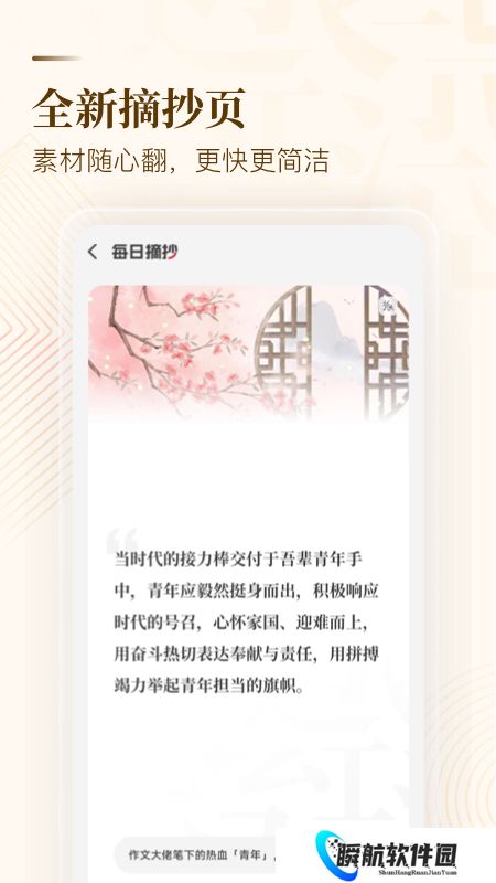 小纸条也被叫做作文纸条app,是专为中小学生们打造的一款写作助手软件,还在为考试的800字作文而冥思苦想吗,不妨从现在开始积累作文素材,每天花十分钟看一看适合添加到作文中的金句,名言警句、万用举行,甚至还有游戏与电影中的经典语录,按照自己的作文主题选择引用,让你的作文瞬间在阅卷老师的眼中高大上起来,文章不再枯燥够新颖,也不用再为作文字数不够硬凑的问题了。