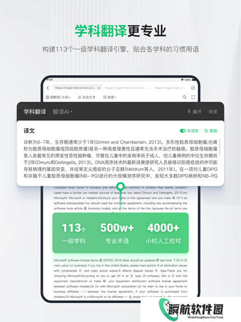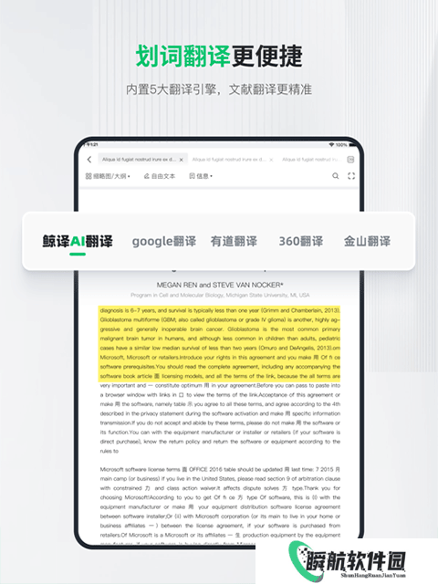 小绿鲸文献翻译是一款以英语文献作为主打的阅读器软件,可以直接连接知网、百度文库等文献搜索站点,直接将英语论文原文导入到app中,一键即可将外语文章转译成为简体中文,无论是科学研究还是编写论文都可以满足你的文献查询需求。可以实现平板、网页、手机三端数据互通,登录同一个账号能够将文献查询记录、笔记同步到多平台上。