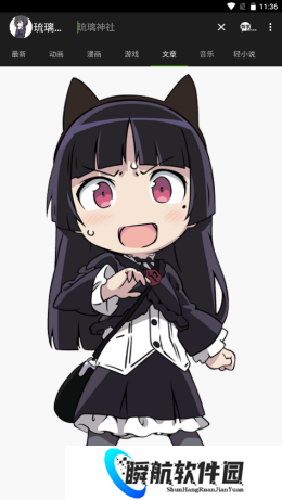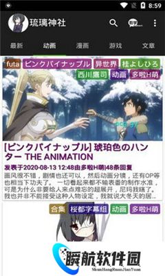 1、打开琉璃神社APP,在首页中即为大家带来最新投稿、动画、漫画、游戏、文章、音乐和番剧等分类;