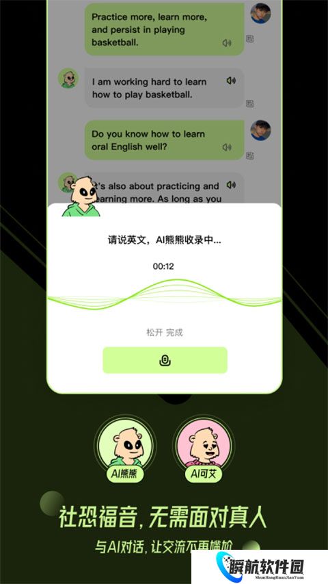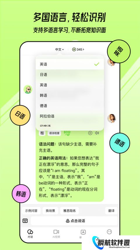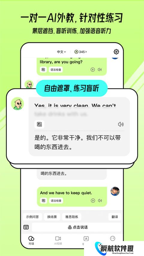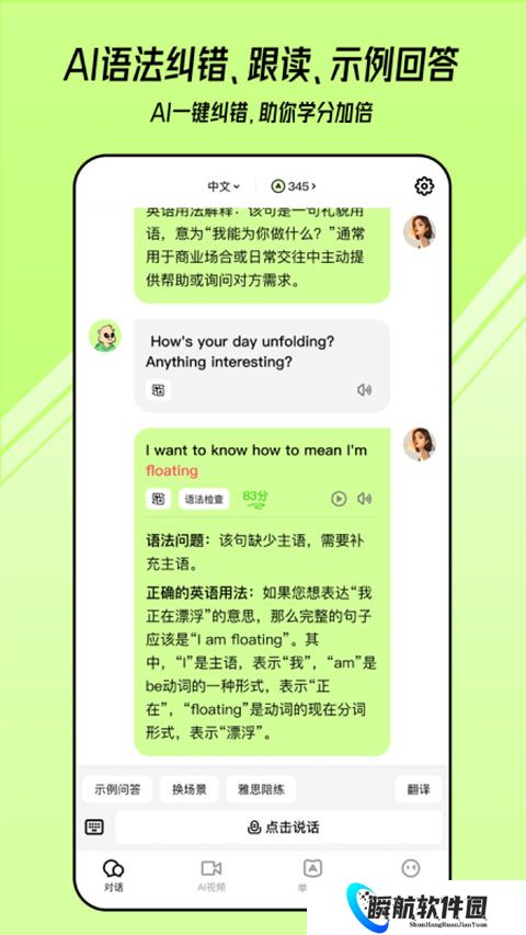 1、采用智能对话技术,与智能助手24小时不间断口语交流,以获得最地道的外语表达。