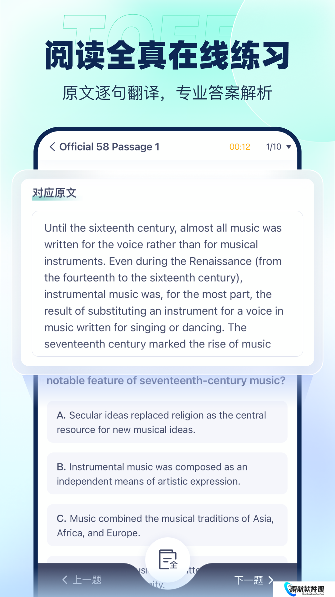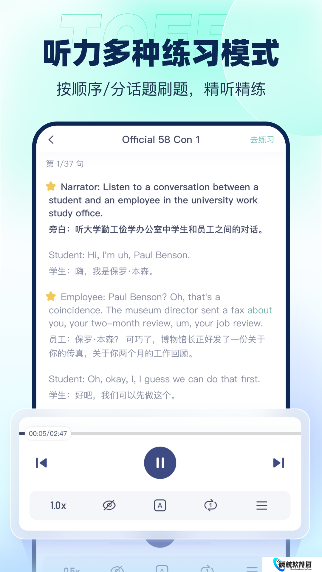 3、托福考试真题原文精听精练,中英文对照翻译,支持逐句倍速,练英语听力更有效。