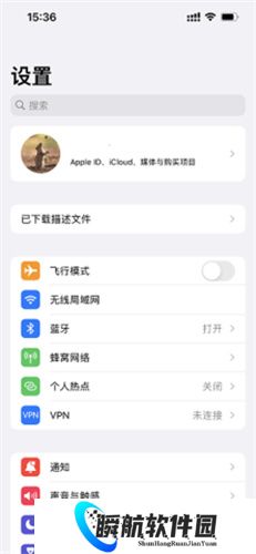7、然后返回桌面进入设置,找到AppleID头像下面的一下子描述文件。