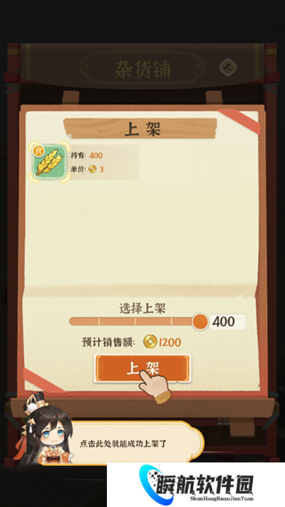 6、点击杂货铺,点击“补货上架”可以减食品进行上架售卖,赚取金币