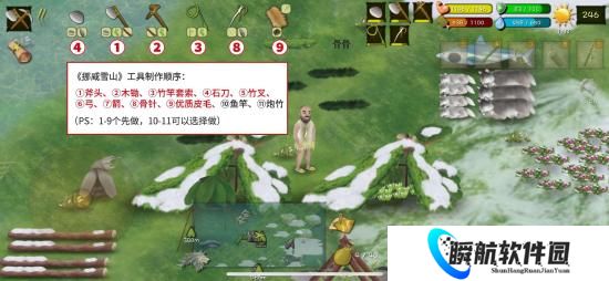 开局制作工具的先后顺序:①斧头、②竹竿套索、③木锄、④石刀、⑤竹叉、⑥弓、⑦箭、⑧除虫剂、⑨骨针、⑩炮竹