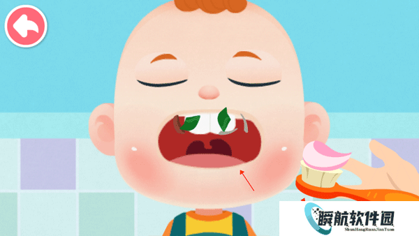 4、当小孩的脸被擦干净后,他会露出他的牙齿;这时,你需要用牙膏将牙齿上的脏东西刷掉,以保持口腔的清洁;你可以用手指在屏幕上滑动,模拟刷牙的动作;刷完牙后,用水给口腔漱口,使牙齿变得干净清爽;