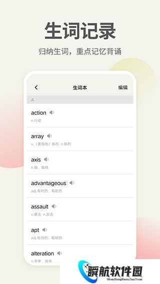 3、内置字典词典,英语无门槛翻译,不会的单词和表达直接查,还能收藏到生词表再复习。