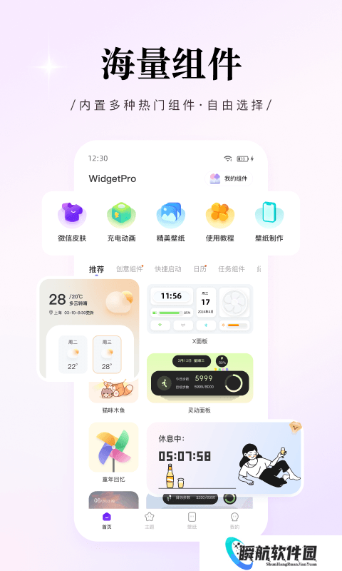 3、包罗万象的小组件库,包含面板、日历、时钟等多种热门元素。