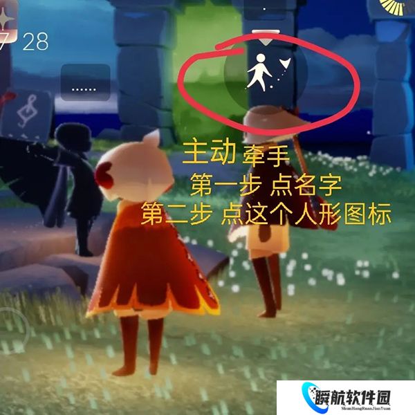 求助状态下,陌生人视角你的头上有牵手图标,陌生的路人点击图标,能够直接从地面上把你牵起来,带你飞和跑;