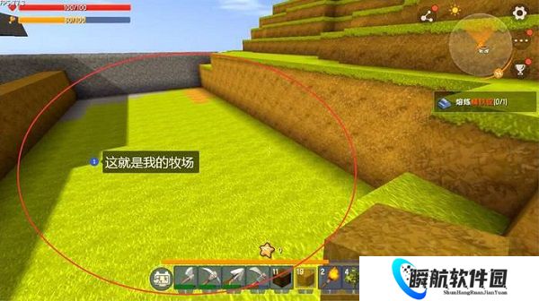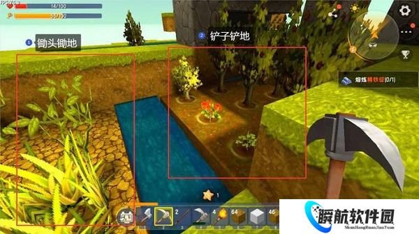 首先我们需要找到一处水源——因为在水源附近,农作物可以得到更好的滋养。接下来就在水源的两侧进行两种截然不同的处理方式:锄地与铲地。因为在《迷你世界》中,农作物与花树草也有着本质的区别:农作物只能种在用锄头锄过的地上;而类似树苗与鲜花这样的种植物,就只能被种在用铲子铲过的土坑里。