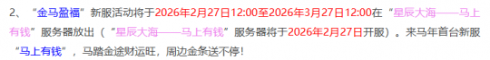 时间服马年首个服务器“星辰大海—马上有钱”在2月27日开启,如今时间服新区热度并不高,远不如畅玩服,这个马年新区火爆应该不会超过半年时间。