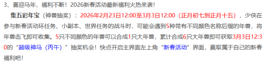 2026新春活动福利,2月23日开始至3月3日期间,参加新春活动:环任务、小副本、世界任务战斗时,会遇到5种带不同颜色名称后缀的年兽,战斗胜利后可以获得对应颜色的年兽,集齐5种颜色可以合成一只大年兽,累积合成6只大年兽可以参加超级神马(丙午)抽奖。