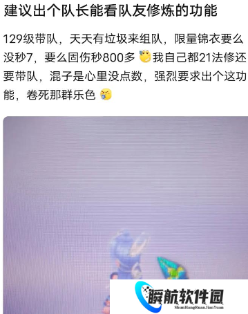 看到有玩家建议出一个队长可以查看队友修炼的功能,原因是自己经常带队,天天都有底子很差的角色来组队,虽然穿着限量锦衣,但不是没秒7,就是固伤秒不过800,自己一个法修21的角色都在带队,那些混队的怎么好意思?所以强烈建议出一个查看队友修炼的功能,以排斥那些底子差的玩家来混队。
