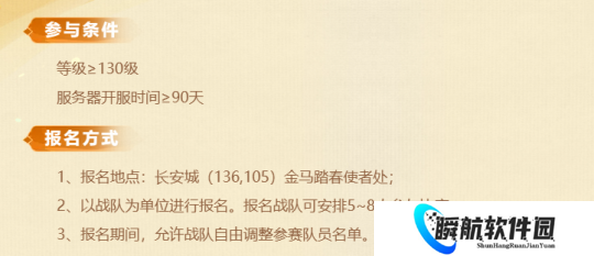 报名方式:长安城(136,105)金马踏春使者处,以战斗为单位进行报名,可安排5到8人参与。