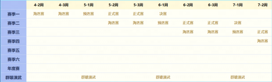 赛事分海选赛、预选赛、正式赛、决赛四阶段,相邻赛季并行,赛事间隙开放群雄演武活动,满足玩家日常竞技需求。