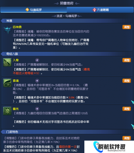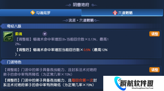 本次调整中,阴曹地府重点调整了【勾魂阎罗】和【六道魍魉】流派的神器奇经八脉效果。