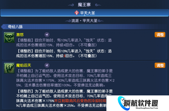 本次调整中,魔王寨只调整了【平天大圣】流派的奇经八脉效果。调整之后,“激怒”的持续回合由4变3,输出能力有所下滑。不过,使用经脉“魔焰滔天”后可立即取消风云变色的冷却时间,也算是变相提升了输出能力。