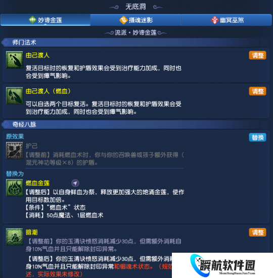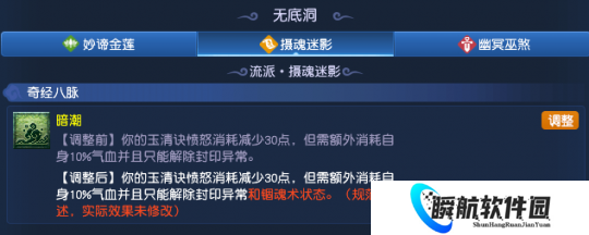 本次调整中,无底洞调整了【妙谛金莲】、【摄魂迷影】、【幽冥巫煞】等流派的奇经八脉效果。