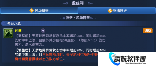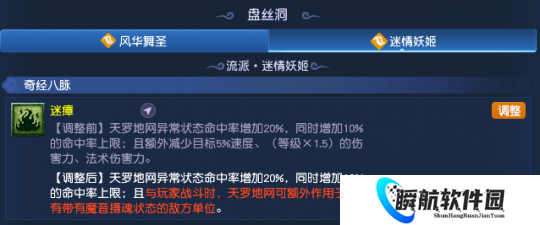 本次调整中,盘丝洞调整了【风华舞圣】、【迷情妖姬】流派的奇经八脉效果。改动之后,“迷瘴”可在与玩家战斗时,额外作用于所有带有魔音摄魂的敌方单位。