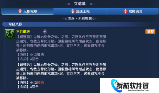 本次调整中,女魃墓虽然调整了全部流派,但实际上都是对奇经八脉“不共戴天”效果改动。调整之后,该技能将由之前的消耗魔法变为消耗愤怒。