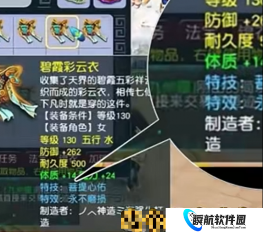 风少他是鉴定出了一件130级的女衣服,这个装备并不是给封系或者物理用的,它是一个法系的装备。我们看到初始防御是262点,然后加了14点的体质和24点的魔力,这个双加的属性是非常对的。特技上面带的是菩提心,又也是属于实用的一个特技,并且带来特效永不磨损,像这种装备真的是既能比武又能任务使用。
